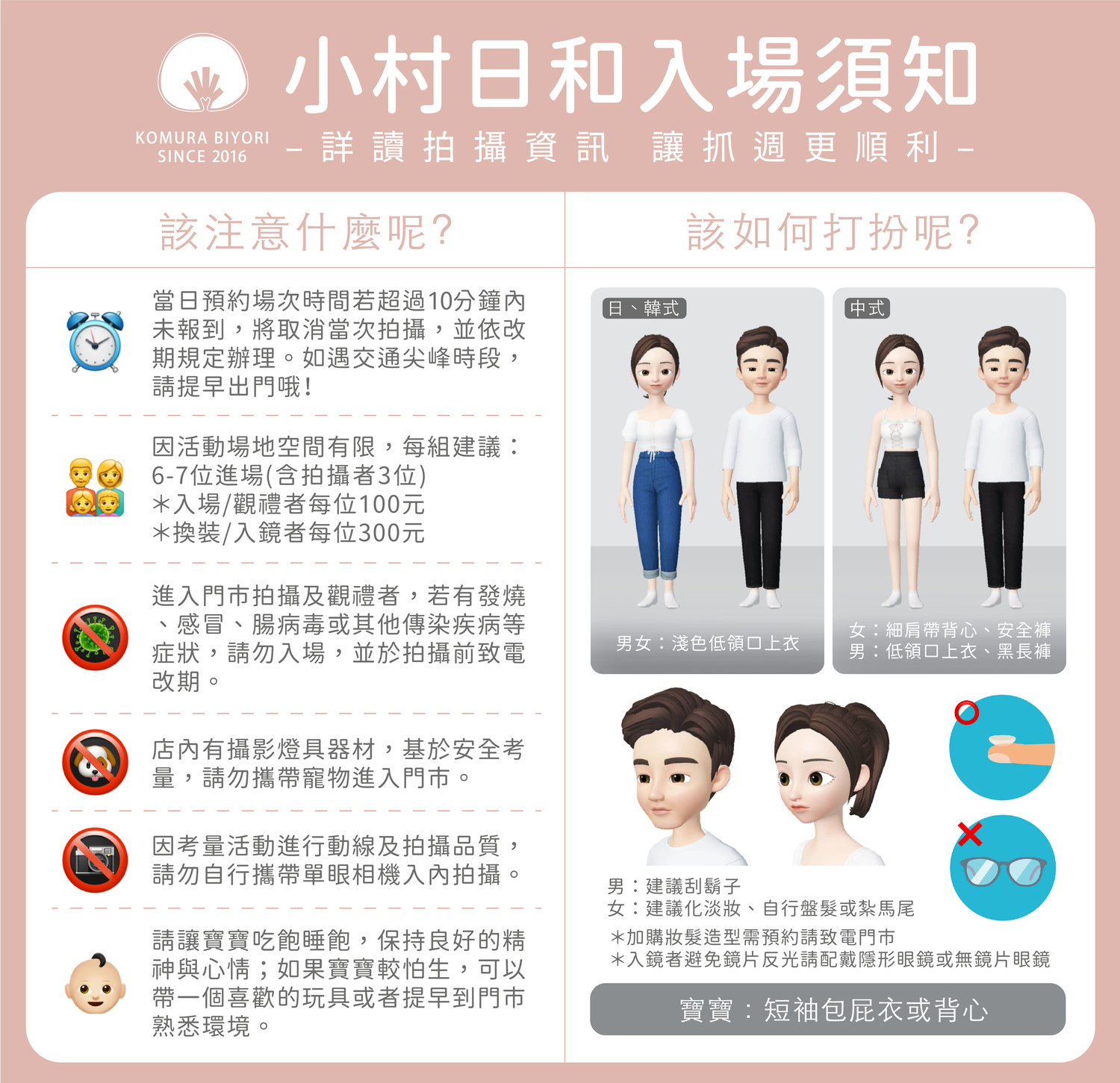 - 抵達時間:活動當天提前15-20分鐘到場進行報到程序,如遇交通尖峰時段請提早出門喔! *為避免影響其他準時報到之消費者權益,當日預約場次如超過10分鐘未報到,將取消當次拍攝,並依改期規定辦理。