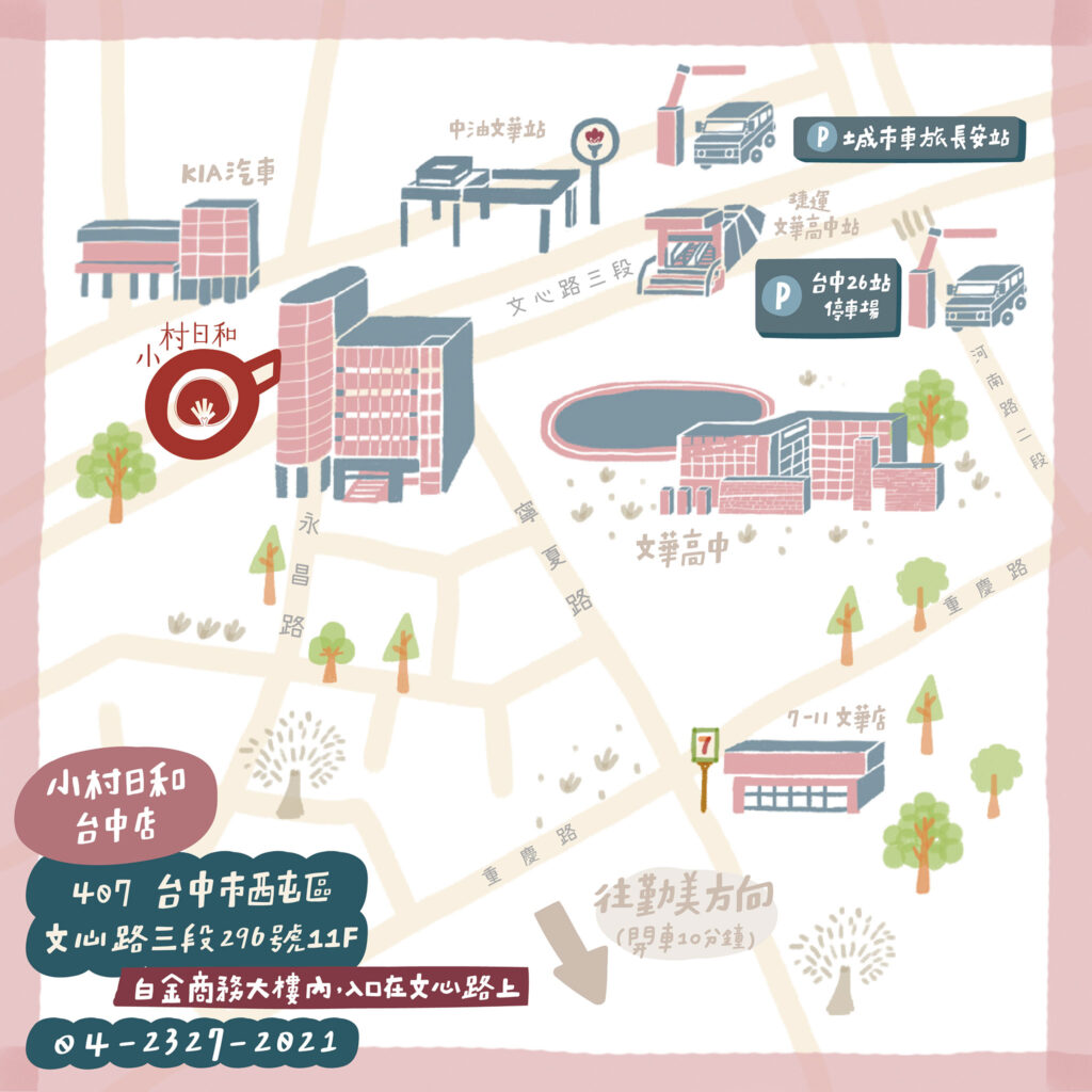 台中市西屯區文心路三段296號11樓電話:(04)2327-2021營業時間:每週一、週三至週日 10:00-18:00每週二固定公休